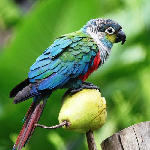 Crimson Bellied Conures are medium-sized parrots, typically measuring around 10 inches in length. Their most striking feature is their bright crimson belly, complemented by green wings and back, blue flight feathers, and a subtle maroon tail. Their expressive eyes and lively demeanor make them visually captivating and highly engaging pets.